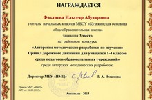 "1-4 класс укучыларына юл йөрү кагыйдәләрен өйрәтү" авторлык методик эшкәртмәләр конкурсында башлангыч клас укытучысыс Фазлиева Илсөяр Әбударовна 3 урынны яулады. Котлыйбыз, килчәктә дә уңышлар теләп калабыз.