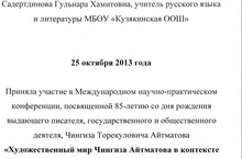 Күренекле язучы, дәүләт эшлеклесе Чыңгыз Айтматовның тууына 85 ел тулу уңаеннан Казан шәһәрендә оештырылган Халыкара фәнни-практик конференциядә безнең укытучыларыбыз Садертдинова Г.Х., Шарафетдинова Н.В. лар катнашты.