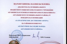 "Актаныш халкының мәдәни мирасы" район конкурсында укытучы Шарафетдинова Н.В. Мактау грамотасы белән бүләкләнде.