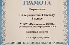 Ученица 8 класса Садертдинова Тансылу заняла 2-место в муниципальном конкурсе рисунков "Буду бдительным на льду". Руководитель: Н.В. Шарафетдинова. Поздравляем! Желаем вам дальнейших успехов!