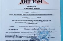 В XIII республиканском конкурсе научно-исследовательских проектных работ "Я выбираю село", проводимом совместно с республиканским олимпиадным центром Кургузской ООШ Зеленодольского района, ученица 9 класса Азалия Ямалеева заняла почетное 3 место.