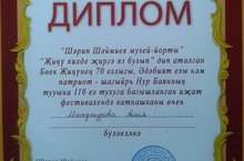 В конкурсе творческих работ, посвященных 70-летию Великой Победы, в честь юбилея поэта-патриота Нур Баяна участвовала ученица 8 класса Алия Магданурова и награждена дипломом. Поздравляем!