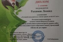 Воспитанник детского сада Рахимов Леонид стал победителем в номинации "Лучший исполнитель стихов среди детей 4-5 лет" и занял 2 место в региональном конкурсе чтецов стихов Шауката Галиева "Шавәли дуслары". Поздравляем и желаем новых творческих успехов!