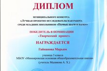 Ученица 3 класса Гайнанова Марьям участвовала в муниципальном конкурсе «Лучшая проектно-исследовательская работа среди младших школьников «Первые шаги в науку» и стала победителем в номинации «Творческий проект». Руководитель: Маликова А.Х. -