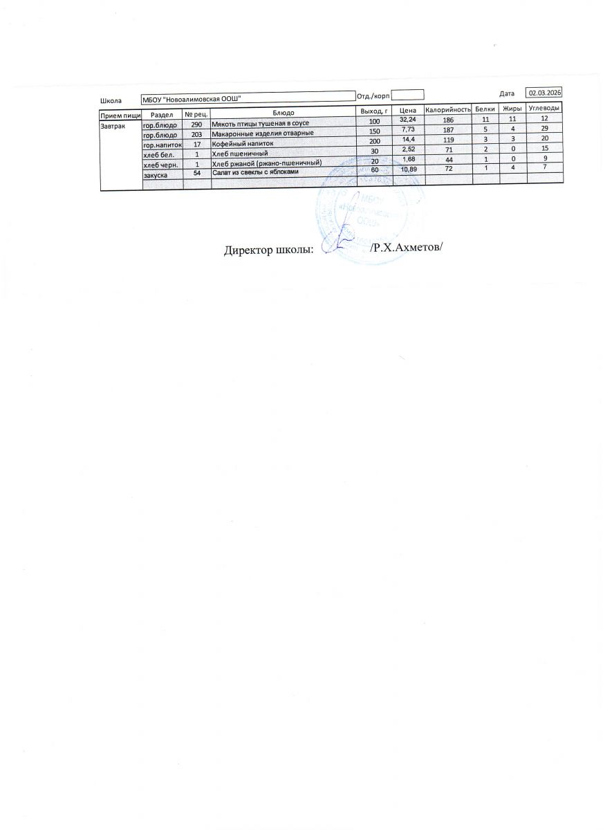 Однодневное меню на 2 марта 2026 г.