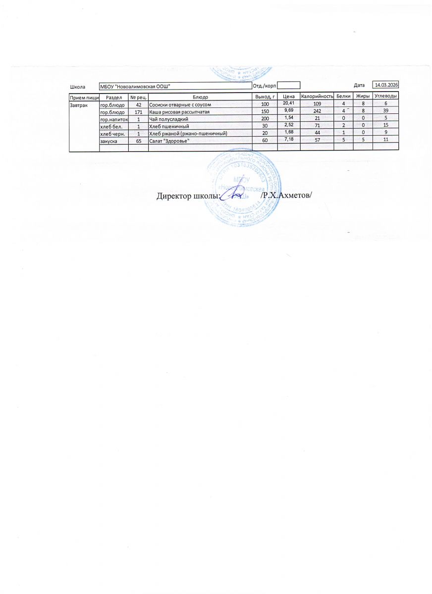 Однодневное меню на 14 марта 2026 г.