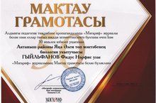 Алдынгы педагогик тәҗрибәне пропагандалауда «Мәгариф» журналы белән озак еллар тыгыз иҗади хезмәттәшлектә булганы өчен һәм 50 яшьлек юбилее уңаеннан мәктәбебезнең биология укытучысы Гыйльфанов Фидус Нәрфис улы «Мәгариф» журналының Мактау грамотасы белән бүләкләнде.