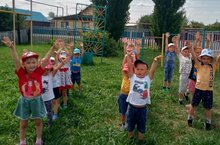 Бакчабызда Һәр иртә саф һавада иртәнге гимнастикадан башлана. Күңелле музыка астында узган иртәнге гимнастика балаларның сәламәтлекләрен ныгыту белән берлектә, кәефләрен дә күтәрә. Шуңа күрә аны һәр бала зур теләк белән башкара./Утренняя гимнастика на свежем воздухе является основополагающим средством оздоровления и воспитания детей в нашем детском саду. У детей, систематически занимающихся утренней гимнастикой, пропадает сонливое состояние, появляется чувство бодрости, наступает эмоциональный подъем, повышается работоспособность.