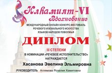 Уртанчылар төркеменнән Хасанова Эвелина Элмир кызы "Илһамият - VI" Халыкара бәйгедә катнашып, "Нәфис сүз" номинациясендә 3 нче дәрәҗә дипломга лаек булды. Тәрбиячесе: Әгъләмова Р.Х. Аларны уңышлары белән котлыйбыз!
