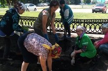 Бакчабызның алдына чәчәк үсентеләре утырттык. / Посадили перед детским садом цветы.