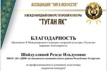 "Туган як" II Халыкара татар мәдәнияте конкурсында катнашып, фортепиано бүлеге укучылары Зиннурова Әминә, Валиев Юныс 1 нче дәрәҗә лауреат, Гимадиева Ясминә, Набиева Адилә 2 нче дәрәҗә лауреатлар, укытучылары Резеда Шайдуллина, вокал бүлеге укучыларыбыз Валиева Арина, Закирова Гөлинә 1 нче дәрәҗә лауреат, Гараева Айсинә 2 нче дәрәҗә лауреат булдылар.Укытучылары Гүзәлия Чекалина. Укытучыларыбыз рәхмәт хаты белән бүләкләнде.КОТЛЫЙБЫЗ!