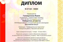 Рәсем бүлеге укучысы Галимуллина Язилә "Достижения юных" балалар һәм яшьләр өчен бөтенрәсәй конкурсында катнашып, 2 урын алды. Укытучысы Айрат Сарваров. КОТЛЫЙБЫЗ!