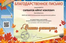 Актаныш сәнгать мәктәбенең рәсем бүлеге укучылары "Осенние фантазии" бөтенрәсәй иҗади конкурсында катнашып, зур уңышларга ирештеләр: Галилимуллина Язилә, Нуруллина Алсу, Фахразиева Гөлзада, Мухаметдинов Ильяр - II дәрәҗә диплом, Касымова Айзилә, Игнатьев Богдан, Саетгараева Ләйлә - III дәрәҗә дипломнар белән бүләкләнделәр. Укытучылары Айрат Сәрвәров рәхмәт хаты белән бүләкләнде.КОТЛЫЙБЫЗ!