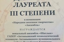 В Республиканском фольклорном конкурсе "Народы поволжья" вокальный ансамбль "Шатлык" Актанышского технологического техникума стала лауреатом 3 степени