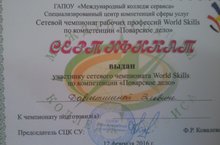 12 февраля 2016 года студент 3 курса Давлетшина Эльвина приняла участие в сетевом чемпионате рабочих профессий World Skills Russia по компетенции "Поварское дело" и была награждена сертификатом. Руководитель, мастер производственного обучения Валиева Лилия Ринатовна выступила экспертом.