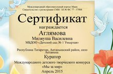9 май Бөек Җиңүнең 70 еллыгы уңаеннан "МААМ.РУ" сайты үткәргән "Мы за мир" конкурсында безнең балалар бакчасының 2 нче кечкенәләр төркеменә йөрүче Басыйрова А. катнашып сертификатка ия булды. Җитәкчесе Аглямова М.В. Бу уңышлары белән чын күңелебездән котлыйбыз!