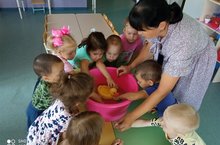 Сегодня дети 1-й младшей группы провели опыты с водой. Они узнали, что вода жидкая, бесцветная, без запаха.