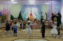 В нашем саду проходят праздничные утренники, посвященные Новому году. Дети из младшей группы сегодня кружились вокруг елки, исполняя свои песни. Вместе со Снегурочкой и Зайцем, пришедшими на праздник, танцевали красивые танцы.