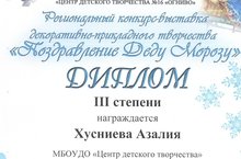 Хусниева Азалия Айнуровна стала победителем 3 степени в Региональном конкурсе - выставке декоративно - прикладного творчества "Поздравление Деду Морозу"