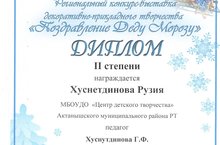 Хуснетдинова Рузия награждена дипломом 2 степени в Региональном конкурсе - выставке декоративно - прикладного творчества "Поздравление Деду Морозу"