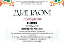 Обучающаяся кружка оригами «Модульное диво» Шакирова Малика стала победителем Республиканского творческого конкурса, посвященного татарскому народному искусству и фольклору «Культура - наше достояние» - «Мәдәният - безнең байлыгыбыз» в номинации: «Декоративно-прикладное искусство». Педагог - Султанова Фируза Марселовна.