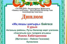 "Көмеш кыңгырау" республика балалар һәм яшүсмерләр газетасы үткәргән "Иң яхшы шигырь"бәйгесендә 2 урын алган Актаныш Балалар иҗат үзәгенең "Сәнгатьле сүз"түгәрәгенә йөрүче Язилә Хәбетдинованы котлыйбыз!Җитәкчесе- Ләйсән Газизова.