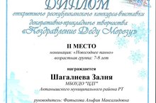 "Камский институт искусств и дизайна" и МАУДО "ЦДТ" г.Наб.Челны провели открытый республиканский конкурс-выставку декоративно-прикладного творчества "Поздравление Деду Морозу". Салахова Альбина награждена поощрительным Дипломом в номинации "Лучший Дед Мороз".Шагалиева Залия заняла 2 место в номинации "Новогоднее панно" и награждена Дипломом.Руководители:Фазуллина Г.Х., Фатыхова А.М.Яр Чаллы шәһәрендә үткәрелгән "Кыш бабайга котлау"бәйге- күргәзмәсендә катнашып,Салахова Аделина хөрмәтләү Дипломына,Шагалиева Зәлия мактаулы 2 урынны яулап, җиңүче Дипломына ия булдылар.Укучыларны һәм аларның җитәкчеләрен чын күңелдән котлыйбыз! -