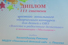 Мөмкинлекләре чикләнгән балалар өчен "Бергә шатлыклы балачак" дип аталган алтынчы зона иҗат конкурсында "Сабый" номинациясендә Хөснетдинов Рамзан (тәрбияче Латипова Р.Р.) III дәрәҗә диплом белән бүләкләнде. Афәрин, котлыйбыз!!!// В шестом зональном творческом конкурсе для детей С ОВЗ "Вместе в радостное детство" в номинации "Малышок" воспитанник младшей группа Хоснетдинов Рамзан (педагог Латипова Р.Р.) награжден дипломом III степени. Молодцы, поздравляем!!!//