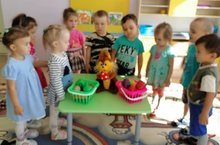 Кечкенәләр төркеме балалары яшелчә һәм җиләк җимешләрне төркемләп тиенкәйгә бүләк иттеләр.\\Дети младшей группы сгруппировали овощи и фрукты и подарили белочке.