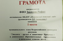 Республика конкурсының муниципаль этабында 1 урынны алган Зарипов Рифатны (җитәкчесе Акмалова Л.Р.)котлыйбыз. Молодец, Рифат.// В муниципальном этапе республиканского конкурса "Эколята-друзья и защитники природы" воспитанник средней группы Зарипов Рифат (воспитатель Акмалова Л.Р.) занял 1 место. Поздравляем!!!
