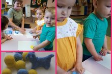 Беренче кече яшьтәге ләр төркеме балалары гади булмаган бөртекле пластилиннан бүген төрле шарлар әвәләделәр. Кече яшьтән үк бармак мускулларын ныгыту өстендә эш алып барыла./Воспитанники группы 1 раннего возраста сегодня занимались очень интересным занятием. Они лепили шарики из необычного пластилина. Детям очень понравилось данное увлечение. В то же время, такое занятие не только интересное и позновательное, а и очень полезное для развития мелкой моторики рук детей.