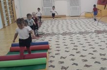 Физкультура эшчәнлекләрендә кечкенәләр төркеме балалары очраган "авырлыкларны" бик тиз үтеп, җитезлекләрен үстерәләр.// На занятиях физкультуры дети 2 младшей группы проходят полосу препятствий.