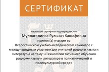 Мәктәбебезнең татар теле һәм әдәбияты укытучысы Гөлназ Муллагалиева 2024 нче елның 22 мартында "Казан федераль университеты" тарафыннан оештырылган "Күпмилләтле мөхиттә туган телне һәм әдәбиятны укыту алымнары" дип исемләнгән семинарда катнашып, сертификатка ия булды.