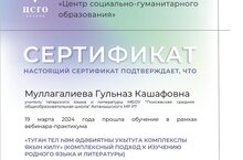 Мәктәбебезнең татар теле һәм әдәбияты укытучысы Гөлназ Муллагалиева 2024 нче елның 19 мартында " Социаль-гуманитар белем бирү" үзәге тарафыннан оештырылган "Туган тел һәм әдәбиятны укытуга комплекслы якын килү" дип исемләнгән 4 сәгатьлек вебинар-практикумда катнашып, сертификатка ия булды.