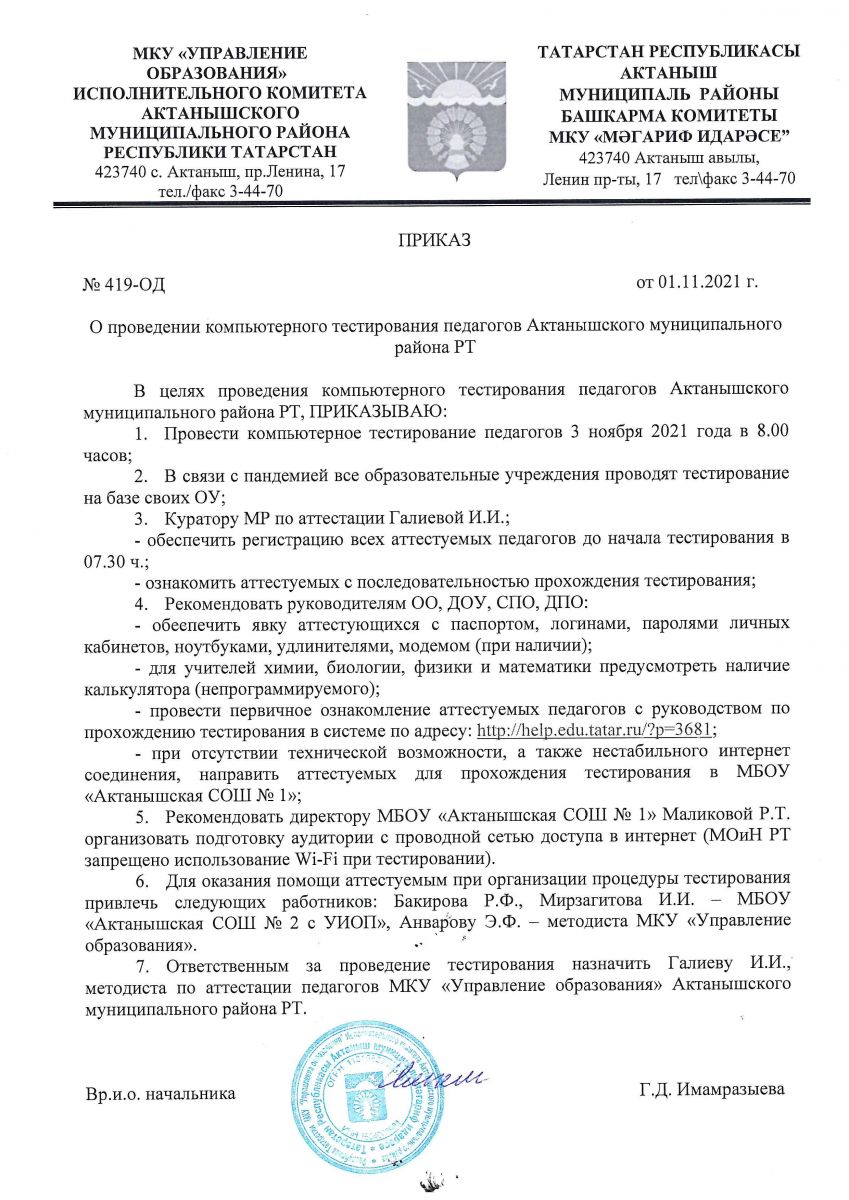 О проведении компьютерного тестирования педагогов Актанышского муниципального района РТ
