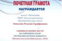 Педагог- библиотекарь нашей школы Зямилова Розалия Гарифяновна заняла I место на районном этапе Республиканского конкурса "Лучшая школьная библиотека - 2018". Поздравляем! Желаем дальнейших успехов!