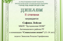 Ученица 8 класса Сафина Лейсан участвовала в VI открытом республиканском конкурсе экологической социальной рекламы «Город под защитой детства» 2018 в номинации «Социальная акция» и получила Диплом II степени. Педагог Зямилова Р.Г. Поздравляем!!!
