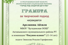 Ученица 6 класса Арсланова Айзиля участвовала в VI открытом республиканском конкурсе экологической социальной рекламы «Город под защитой детства» 2018 в номинации «Рисунок- плакат» и награждена Грамотой за творческий подход. Педагог Зямилова Р.Г. Поздравляем!!!