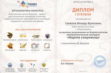 Учащиеся МБОУ “Бугадинская ООШ” продолжают радовать успехами в различных предметных конкурсах и олимпиадах. Под руководством учителяматематики Фардиевой Л.Р. во всероссийском математическом конкурсе “Карта сокровищ” ученик 5 класса Салихов И., набрав 40 баллов, стал победителем и награжден Дипломом 1 степени . Поздравляем!