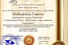 Ученица 8 класса МБОУ “Бугадинская ООШ” Ильфия Нурлыева стала победителем международного конкурса “Евроконкурс» «Сокровища России» - «Малая родина, народ, традиции» в номинации «Литературное творчество. Лучшее сочинение на тему «Моё сердце навеки с тобой, мой край родной…» (на английском языке) с конкурсной работой «East or West – Home is Best». Руководитель – учитель английского языка Т.М.Вазетдинова . Поздравляем!