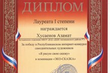 Ученик 4 класса Хусаенов Азамат награжден Дипломом I степени за победу в Республиканском интернет - конкурсе самодельных художников «Я рисую свою сказку» в номинации «ЭКО- СКАЗКА».