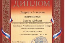 Ученик 4 класса Гаянов Айбулат награжден Дипломом I степени за победу в Республиканском интернет - конкурсе самодельных художников «Я рисую свою сказку» в номинации « ДОБРАЯ СКАЗКА».