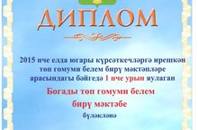 Мәктәбебез коллективы 2015 нче елда төп гомуми белем бирү мәктәпләре арасында бәйгедә 1 нче урынга лаек булды. Белем һәм тәрбия бирүдә югары күрсәткечләргә ирешкән өчен Актаныш муниципаль районы башлыгы Ф.М.Камаевның дипломы белән бүләкләнде. Мәктәп коллективын чын күңелдән тәбрик итәбез!