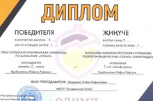 Математика фәненән Республика күләмендә үткәрелгән бишенче ачык “Олимп” олимпиадасында 7 класс укучысы Корбангалин Рафил җиңүче булды. Рафилне һәм укытучысы Фардиева Л.Р. котлыйбыз! Әфәрин!