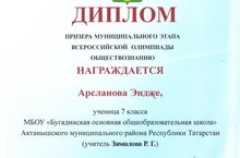 Җәмгыять белеме фәненнән Бөтенроссия фән олимпиадасының муниципаль этабында 7 класс укучысы Арсланова Энҗе призер булды. Энҗене һәм укытучысы Җәмилова Розалия Гарифҗан кызын котлыйбыз! Әфәрин!