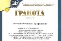 Заместитель директора по воспитательной работе МБОУ «Бугадинская ООШ» Актанышского муниципального района РТ Зямилова Розалия Гарифяновна награждена Грамотой Государственного бюджетного учреждения «Безопасность дорожного движения» за активную работу по пропаганде безопасности дорожного движения, профилактической работы среди населения района, снижения тяжести дорожно- транспортных происшествий.///