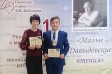 20 апреля 2019 года в Набережночелнинском Институте ФГАОУ ВО «Казанский приволжский федеральный университет», Н(ч)ЭОУ «Гимназия им. В.В. Давыдова» состоялась республиканская, с международным участием конференция исследовательских работ учащихся «Малые Давыдовские чтения». В этой конференции из нашей школы участвовал ученик 7 класса Гаянов Айбулат. Руководитель Фардиева Л.Р. По окончанию выступлений ребят на секциях, был организован «Чемпионат научных состязаний». Самые интересные выступления в каждой секции были отмечены медалями.///