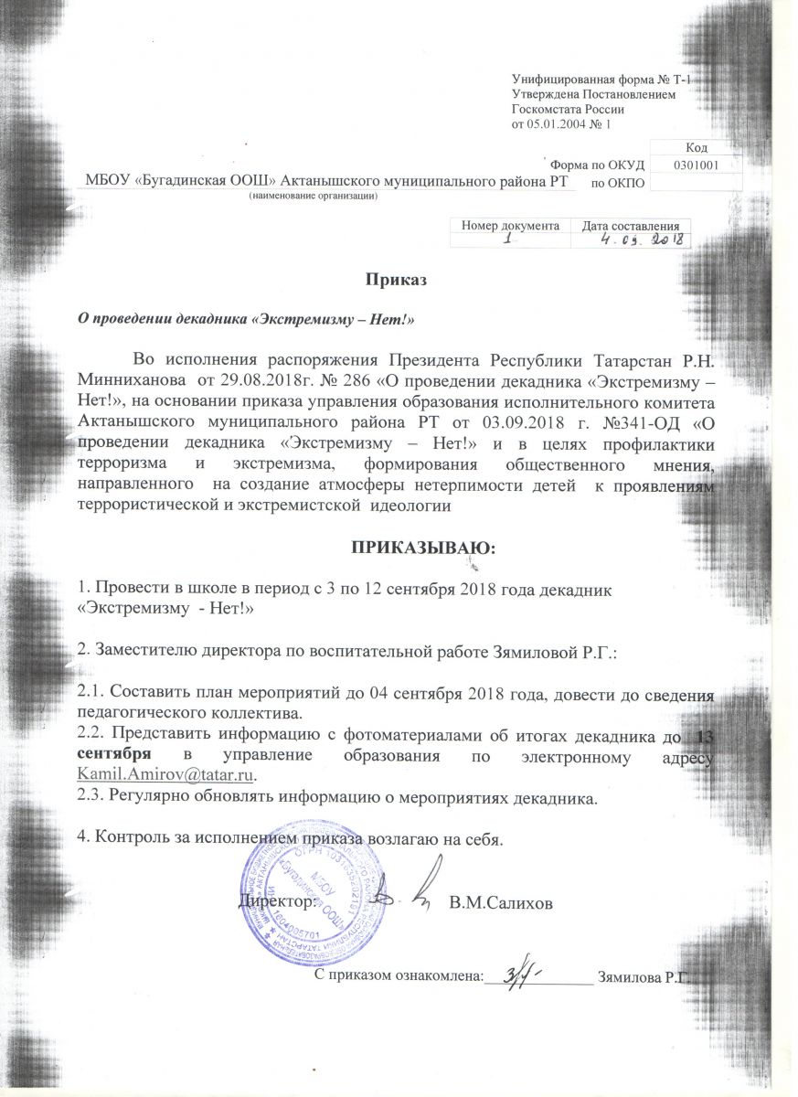 Приказ о проведении декадника Экстремизму нет 2018 год