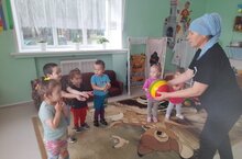 Физик үсеш эшчәнлегендә балалар кечкенә гантельләр белән күнегүләр эшләделәр. Тупны тотып алырга, кире иптәшенә бирергә өйрәнделәр.