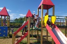 Өлкән һәм мәктәпкә әзерлек төркеме балалары балалар мәйданчыгына бардылар. Балалар бик теләп тауда шудылар һәм таганда атындылар. Балалар күтәренке кәеф алдылар һәм балалар бакчасына шатлынып кайттылар.